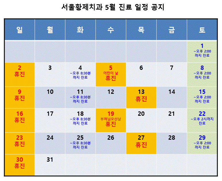 서울황제치과에서 5월 진료 및 휴진 일정을 알려드립니다.